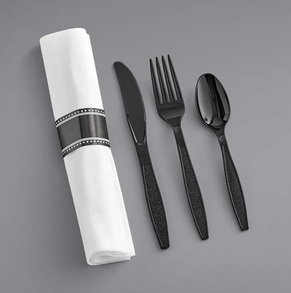 130ROLLKFSBK – 17″ x 17″ White Pre-Rolled Linen-Feel Napkin and Black Heavy Weight, 100/cPlastic Cutlery Set – 100/Case