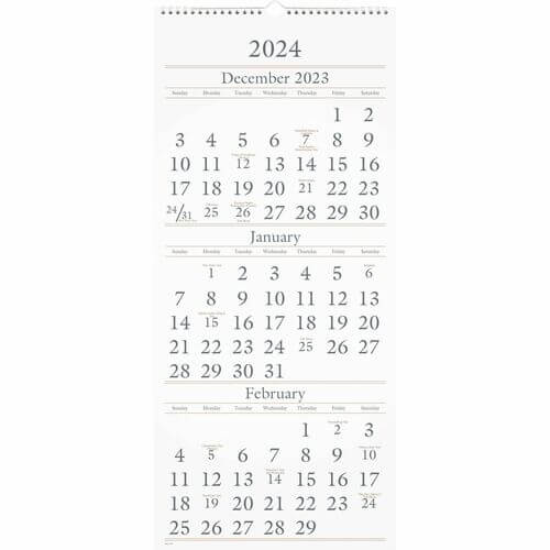 Wall calendar displays three months at a time for thorough planning. Dated planning pages range 14 months from December to January. Monthly wall calendar displays the past, current and future months reference in equal size with large, easy-to-read numbers. Each month includes Sunday-through-Saturday scheduling and holidays. Wire binding has a loop at the top for easy hanging. Calendar pages are printed in two inks on premium buff paper and are supported by a full chipboard back.