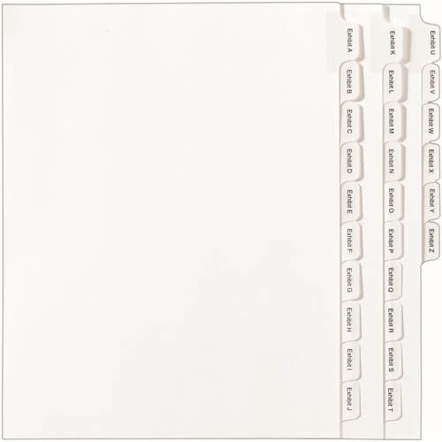 Dividers are ideal for index briefs, legal exhibits, mortgage documentation files and more. White paper stock with clear RipProof reinforced tabs. Side tabs are printed Allstate Style (Helvetica Regular type) on both sides. Binding edge is unpunched so indexes can fit any binding system.
