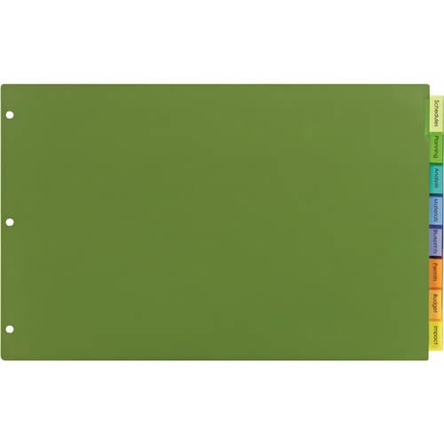 Durable plastic dividers are ideal for frequently referenced, tabloid-size documents that need organizing with tabs in assorted colors. Each set includes eight dividers with insertable tabs in assorted positions for easy referencing. Tab inserts won’t fall out. Special tab design secures inserts, making it easy to insert and remove tab titles. Print the inserts using an inkjet or laser printer. Big tabs and inserts provide 50 percent more printing space for tab titles than traditional, insertable tab dividers. Dividers are three-hole punched for use in binders. Free, easy-to-use templates for Microsoft Word and other popular software programs are available online.