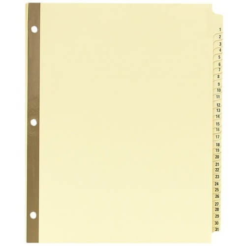 Dividers feature Gold RipProof reinforcing to prevent pullout at binder holes. Laminated tabs are printed front and back with easy-to-read characters. Preprinted, numbered tabs range from 1 to 31. Dividers offer single gold-reinforced binding edge.