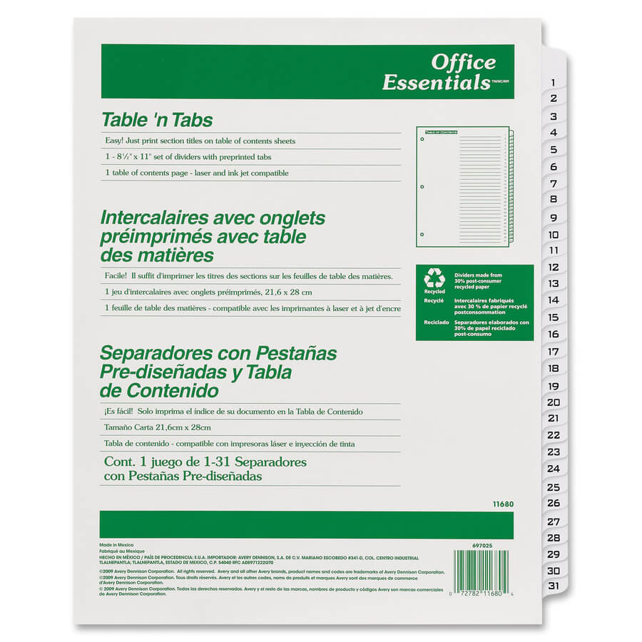 Print or photocopy section titles onto the 8-1/2″ x 11″ Table of Contents page. Tabs come preprinted to match. Table of Contents page is laser, inkjet, typewriter and copier compatible. Make multiple divider sets in minutes.
