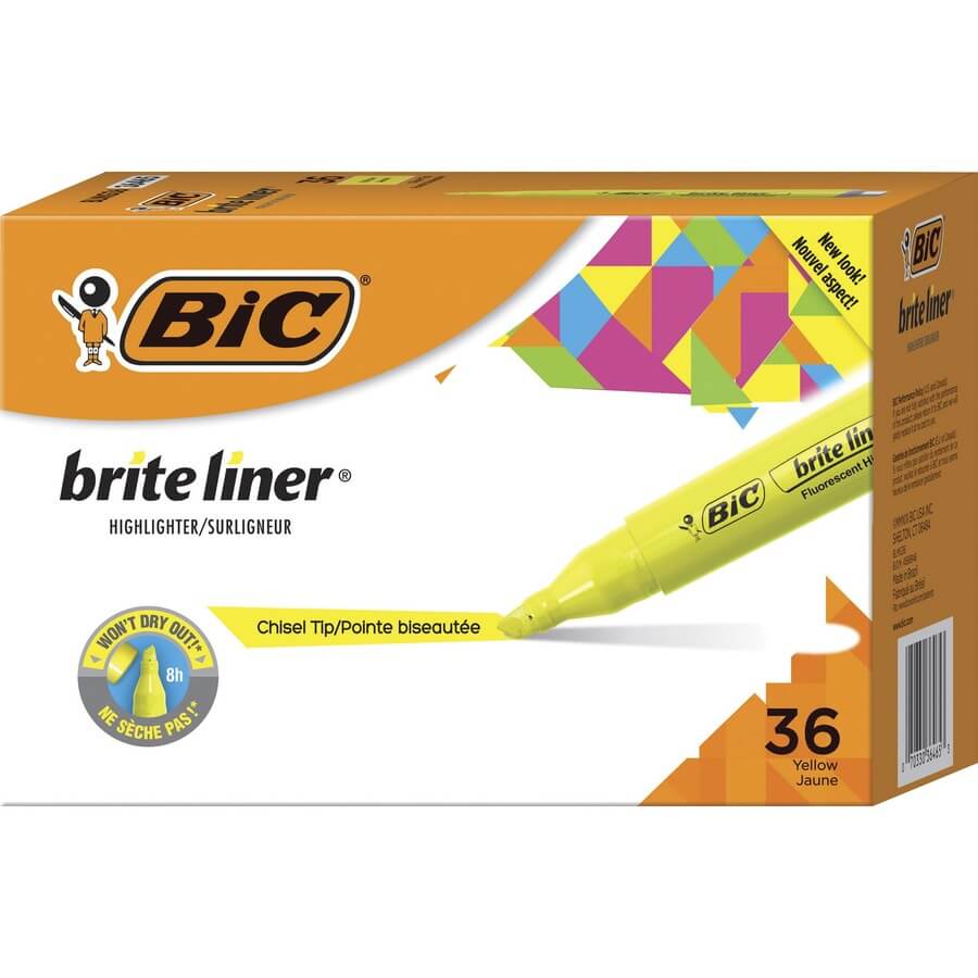 Whether you’re organizing notes or underlining passages in a textbook, Brite Liner Highlighters make highlighting a breeze. These tank-style highlighters deliver super-bright fluorescent ink to help emphasize the important parts of documents, books and notes. Each highlighter creates marks that stand out on the page. Chisel tip allows smooth transitioning between precise underlines and broad coverage sweeps. Built with heavy use in mind, each ACMI-approved, nontoxic highlighter contains a large supply of ink and won’t dry out for up to 8 hours if left uncapped. Brite Liner Highlighters make highlighting fun and are great for use at home, school or office.