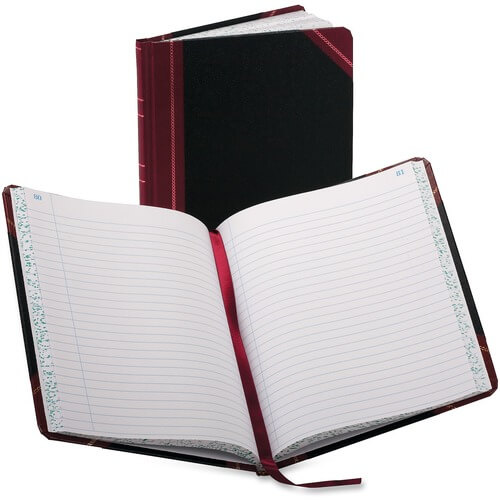 Record book offers a black cover, red fabrihide spine and corners. Each page is made of premium, white bond paper. Paper is acid-free and section thread sewn. Red and blue rulings are waterproof and permanent. Record book offers 27 lines per page, a table of contents page and place-marking ribbon.