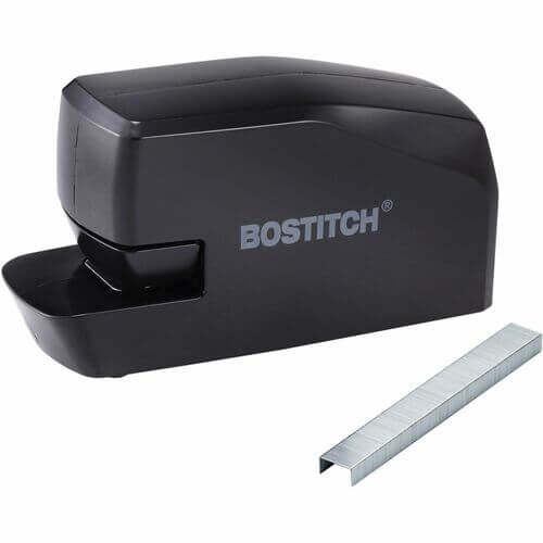 20-sheet electric stapler features extra-wide lead-in and line-of-sight markings that help you intuitively position papers to place staples exactly where you need. Push-button staple loading allows you to easily reload staples for fast refills. Nonskid base prevents it from sliding on smooth surfaces to stay secure when stapling. Simply plug this stapler into an outlet for desktop use, or install four AA batteries (sold separately) for convenient portability. Electric stapler is designed for use with standard-size staples.
