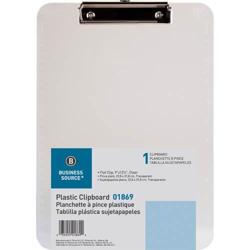 Clipboard provides a stylish, functional way to write without the use of a desk. Flat clip makes this durable, transparent plastic clipboard space-efficient and easy to use. Imprinted rulers on both sides of the clipboard have measurements in Imperial and metric. Clipboard includes a pullout tab for hanging.