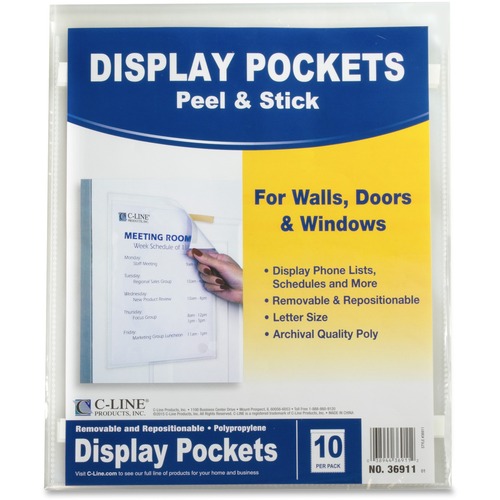 Removable tape-backed display pockets offer built-in antimicrobial additive called Microban to prevent the growth of bacteria and fungi. EPA registered and FDA recognized. Designed to store and display letter-size documents. Attach to walls, doors and more to display phone lists, schedules and more. Display pocket won’t mar delicate surfaces. Made of polypropylene.
