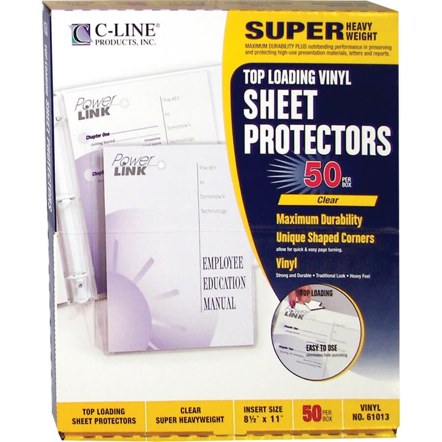 Vinyl sheet protectors provide maximum durability plus outstanding performance. Use to preserve and protect high-use presentation materials, letters and reports. Clean hole punching makes them easy to load into three-ring binders. Unique shaped corners allow quick, easy page-turning. Super-heavyweight sheet protectors offer a clear finish and are made from durable and tough vinyl material.