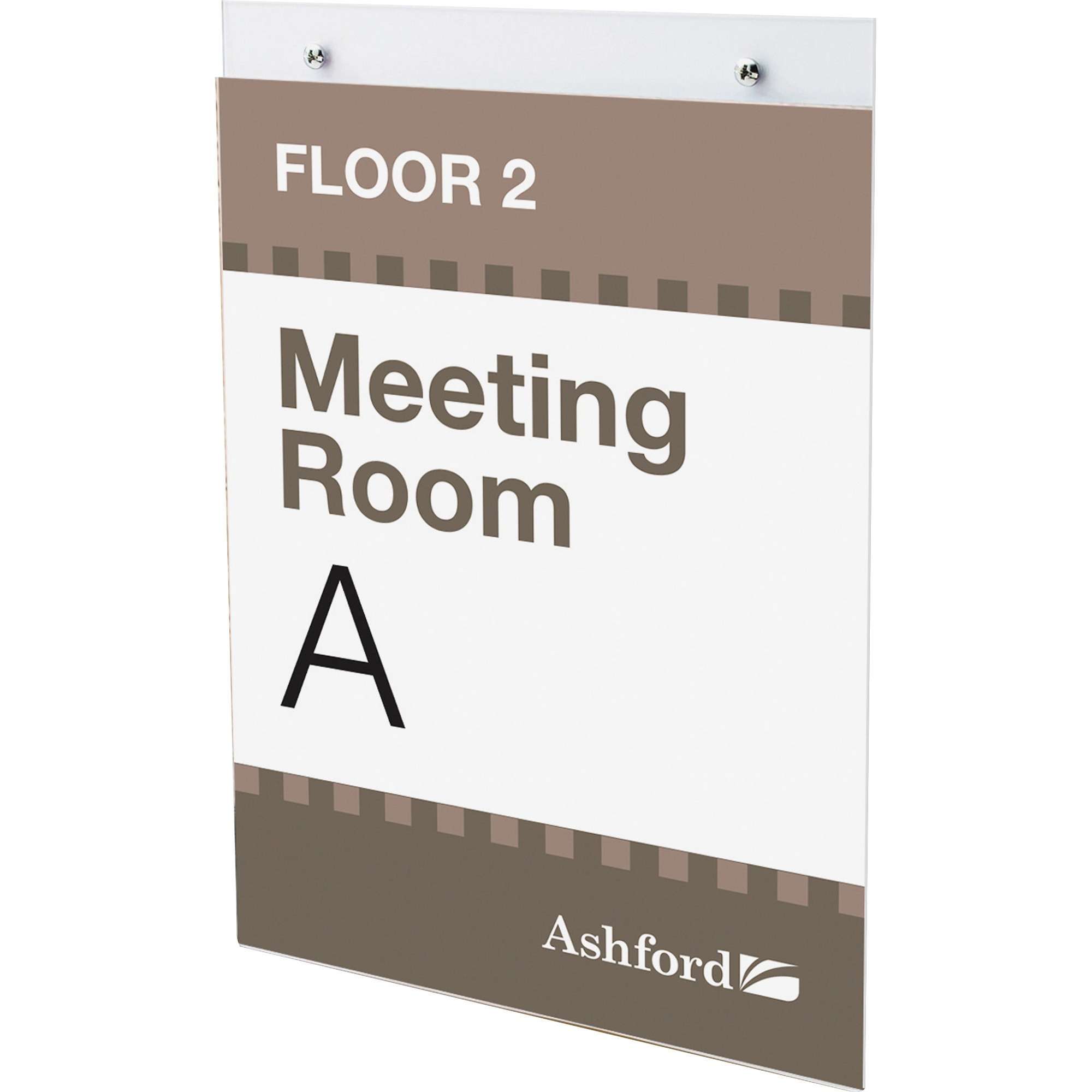 Wall-mountable sign holder saves counter space. Predrilled holes make wall-mounting easy. Sign holder is designed to protect your signs from stains, scratches and tears. Change letter-size sign inserts without removing holder from the wall. Transparent sign holder is made of durable, clear plastic and is recyclable.
