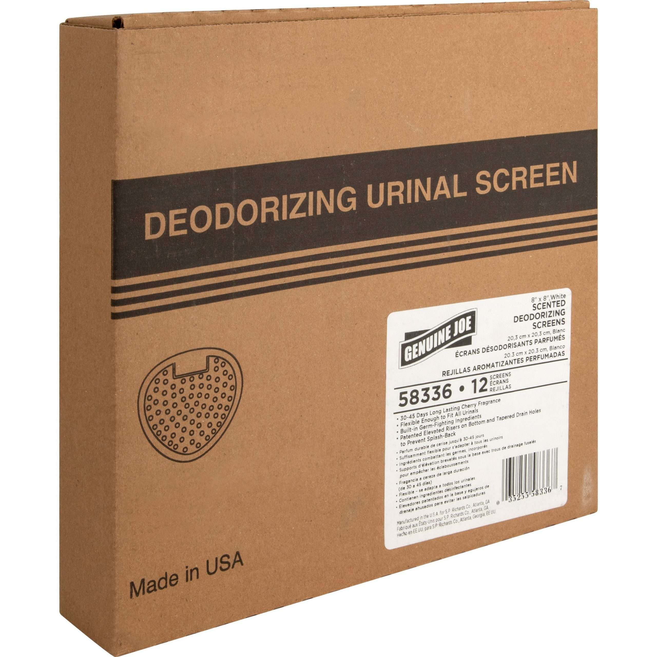 Genuine Joe Deluxe Urinal Screen – Lasts upto 30 Days – Deodorizer, Tapered Drain Hole, Splash Resistant – 12 / Box – White