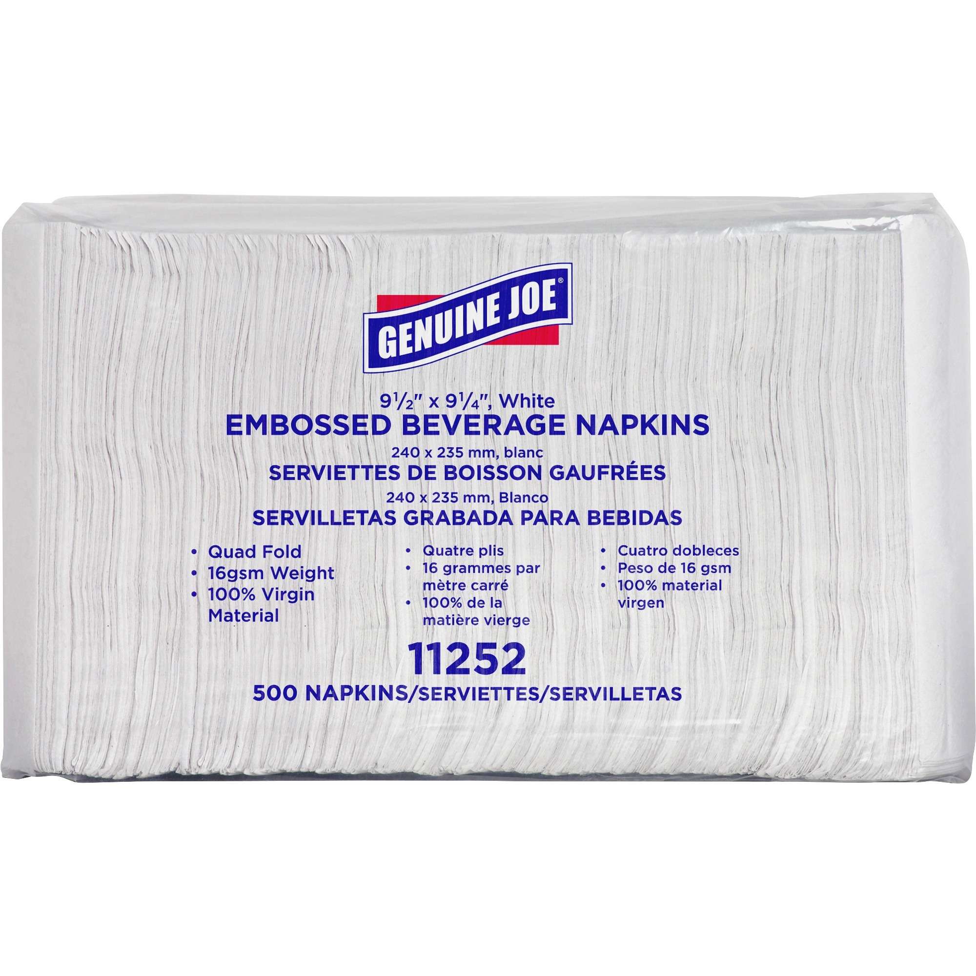 Genuine Joe Quad-fold Square Beverage Napkins – 1 Ply – 9.50″ x 9.50″ – White – Absorbent, Embossed, Quad-fold, Perforated – For Beverage – 500 Per Pack – 4000 / Carton