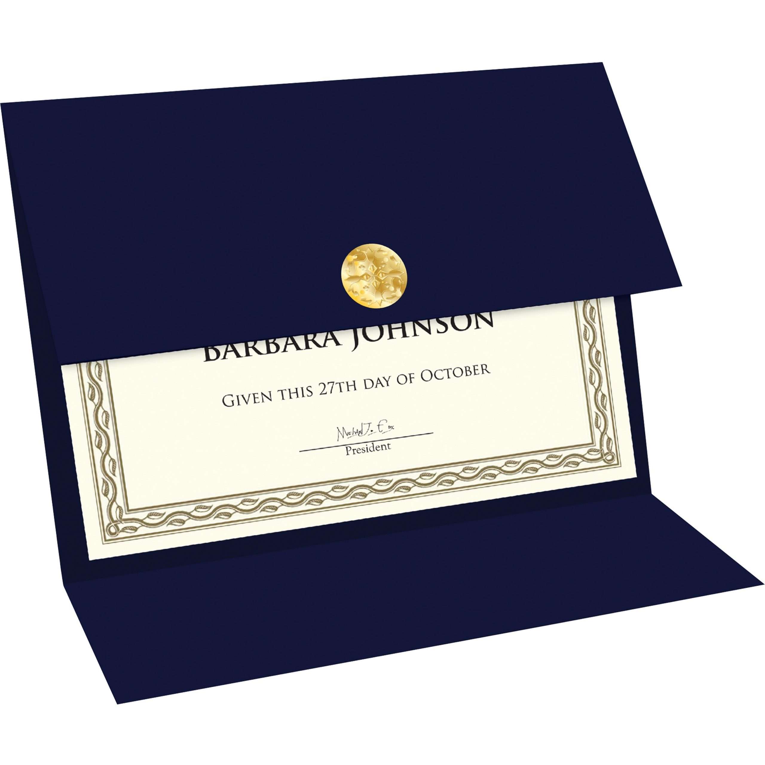Double-fold holder provides a simple way to present your certificates or documents. Sturdy construction features a linen-finish texture for a luxurious look and feel. Foil seal adds a professional embellishment to offer a touch of elegance. Versatile design can be used for either horizontal or vertical display.