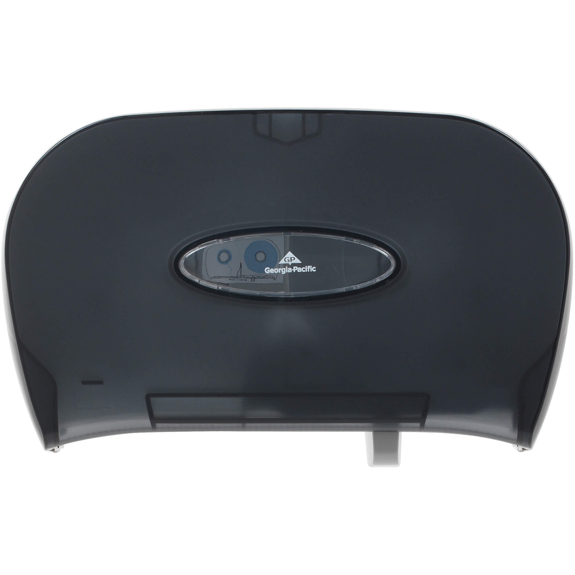 Double-roll, covered bath tissue dispenser is designed to reduce maintenance time, minimize outages and reduce waste. It is ideal for high-traffic areas. Dispenser holds either two rolls of 1,000 sheet two-ply, or two rolls 1,800 sheets one-ply Georgia Pacific Micro-Twin Tissue. Both kinds of rolls can be up to 4″ wide. Sliding gate mechanism helps ensure full utilization of the stub roll, eliminating stub-roll waste. Dispenser can be mounted vertically or horizontally.