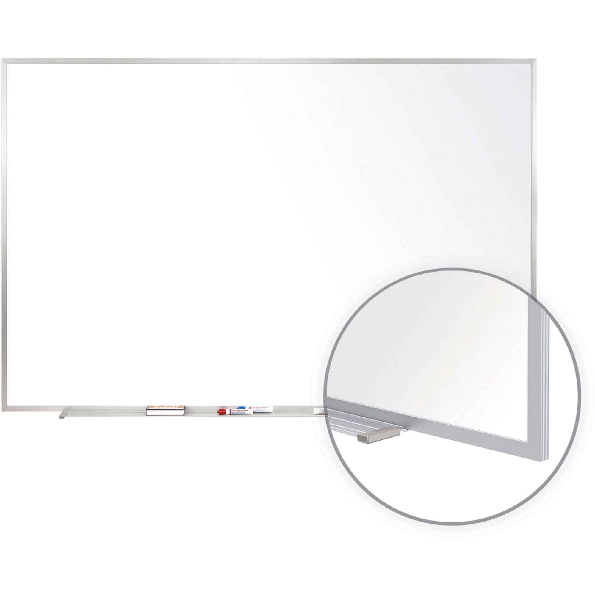 Unsurpassed in performance and durability, aluminum framed porcelain-on-steel markerboard features heavy 28-gauge porcelain steel surface, the hardest available marker surface, on a 3/8″ backing for years of dependable service. Surface resists scratching, denting, staining, and due to its steel substrate, accepts magnetic accessories. Easily installable marker tray with protective end caps is shipped detached to lower damage potential. Markerboard comes with “L” bracket hangers for easy mounting, one marker and one eraser.