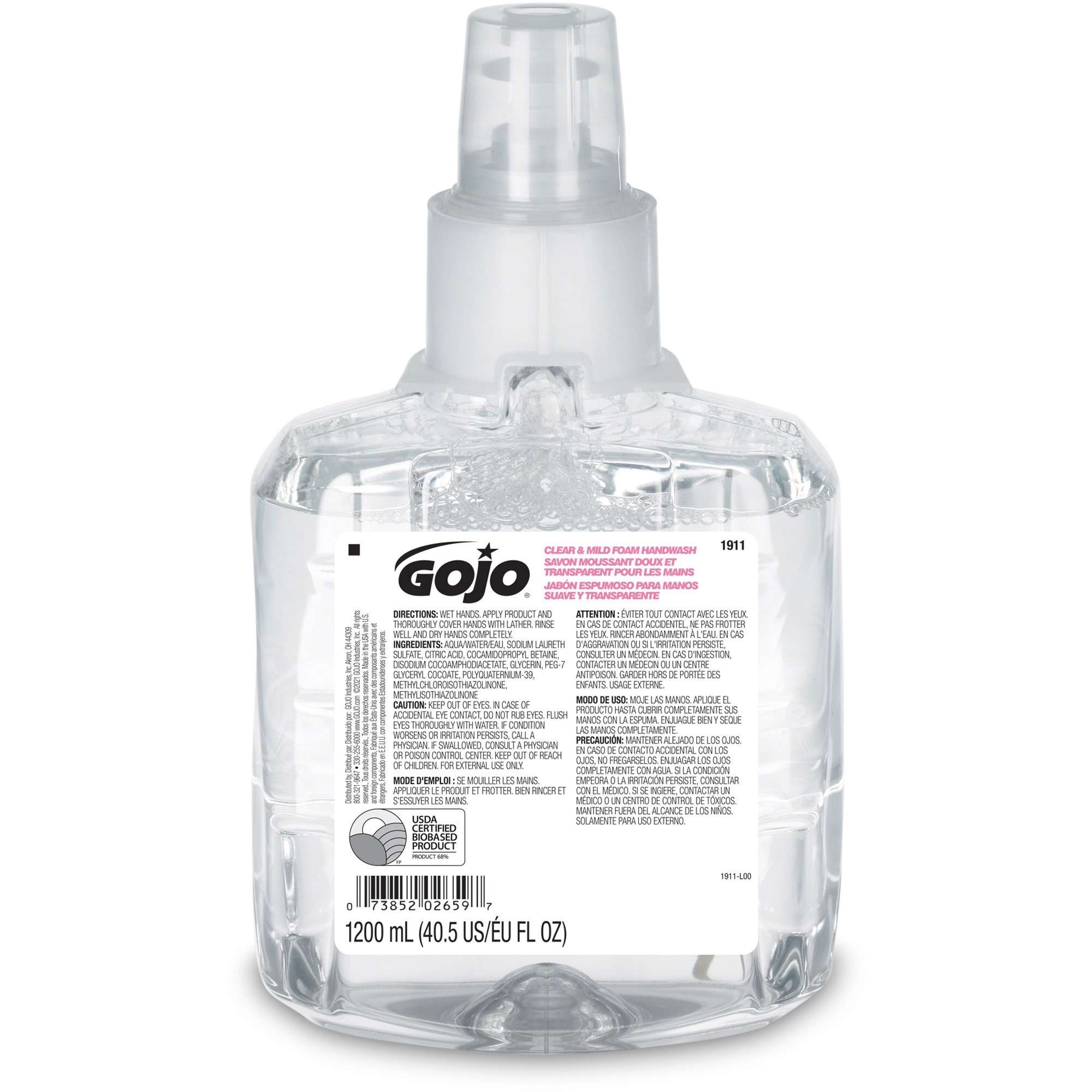 Refill of spa-inspired, foam handwash is designed for GOJO LTX-12 Dispensers and delivers luxurious foam lather in a fragrance-free and dye-free formulation that is enriched with moisturizers and skin conditioners. USDA certified, bio-based, mild formulation is also EcoLogo certified so foam hand soap delights users while supporting a healthy environment. Controlled-collapse GOJO refill holds its shape as it empties for a more attractive appearance. Sanitary-sealed refill helps prevent contamination.