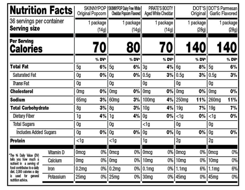 - Package contains twenty-two 0.5-oz snack-size bags of SkinnyPop and Pirate’s Booty, and fourteen 1.0-oz snack size bags of Dot’s