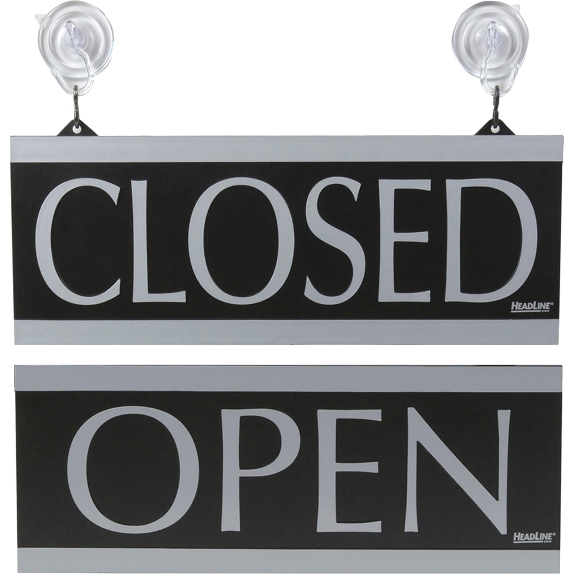 Century Series Sign reads “OPEN” on one side and “CLOSED” on the other side. Both words are in silver with a black background for easy visibility. Sign includes suction cups.
