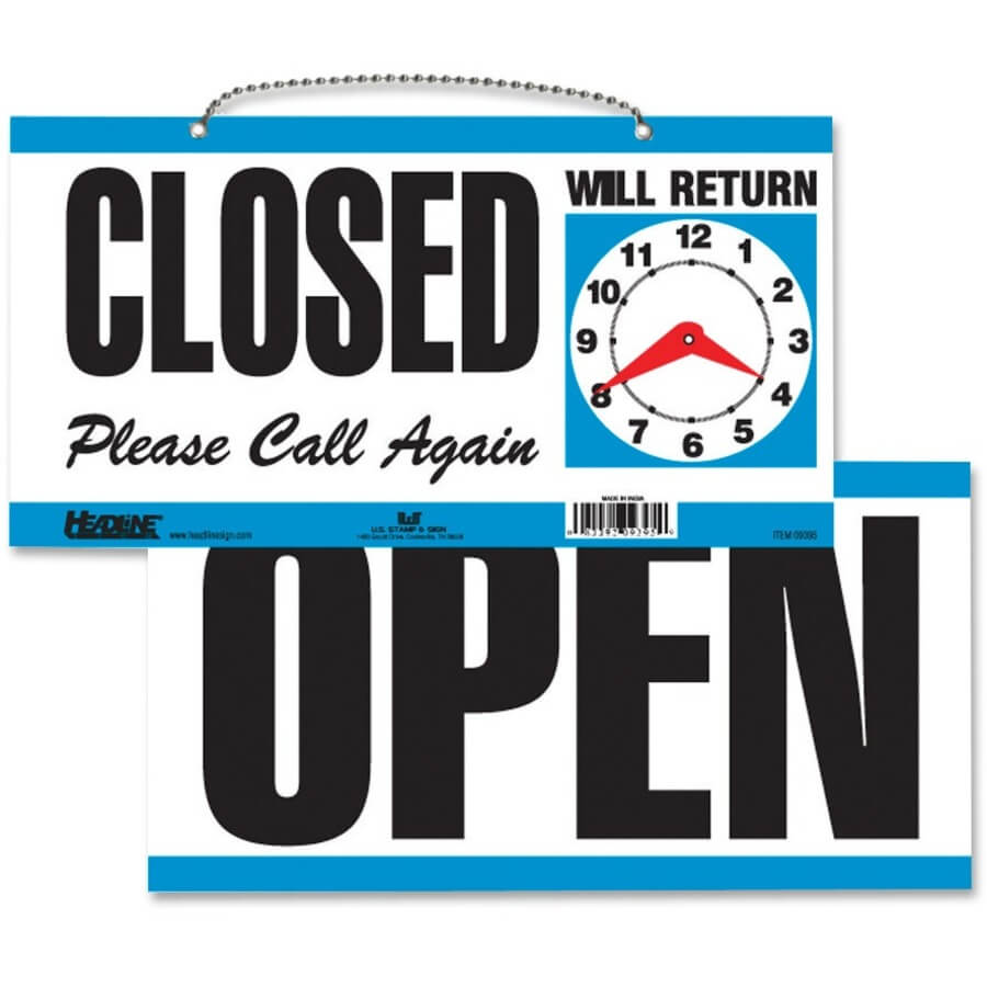 Open/closed sign is designed for indoor and outdoor use. One side displays a bold “Open” sign written in all uppercase letters. The other side displays “Closed” in all uppercase letters above a cursive, “Please Call Again” and next to a “Will Return” time indicator. The hands on the clock face adjust easily.