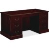 Wood laminate furniture features elegant detailing that include antique brass drawer pulls and raised decorative molding. Tops feature abrasion-resistant and stain-resistant, high-gloss, high-pressure laminate over durable, 1-1/8″ thick, solid-core, high-density particleboard that resists warping. Pedestals have box drawers that operate on ball-bearing suspension with 3/4 extension. File drawers with hangrails accommodate letter-size or legal-size files and operate with full extension. Pedestals feature an interchangeable, core-removable lock to make rekeying quick and easy. Pullout writing shelves are standard on all desk pedestals. Hutch provides 19-3/4″ clearance from desktop. Adjustable, hex-leveling glides easily level out without lifting the desk. Glides have a 3/4″ adjustable range. Furniture is certified by SCS to be in compliance with specific, indoor, air-quality emission requirements and meets or exceeds applicable ANSI/BIFMA standards.