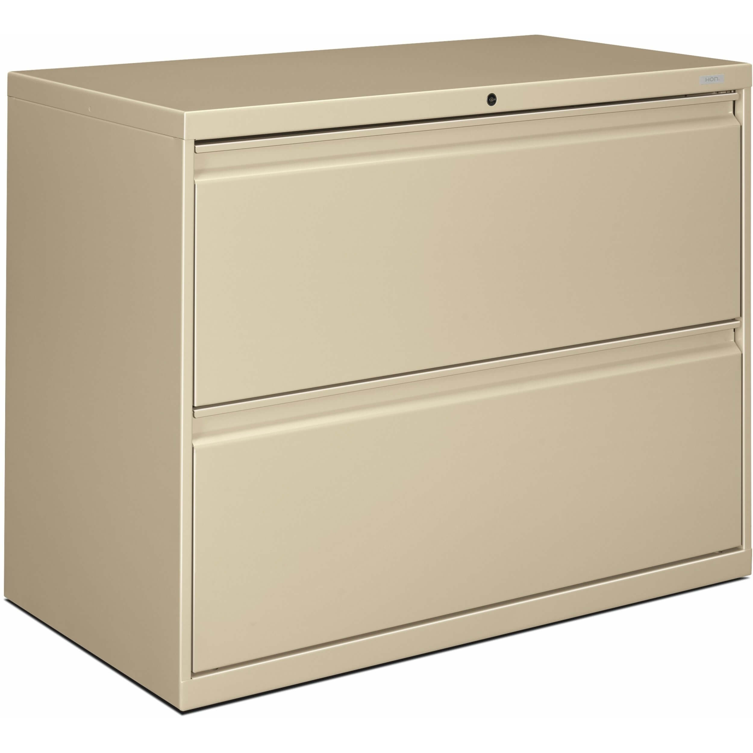 Two-drawer lateral file offers clean lines, reinforced case construction, 36″ width, dual side locks for security, and full-width, designer-style handles. Baked enamel finish over rust-inhibiting, phosphate pretreatment adds more durability. Three-part, telescoping, ball-bearing suspension delivers smooth drawer operation. Drawers accommodate letter-size or legal-size folders from side-to-side with included adjustable hangrails. Drawers are flush at the top and sides and feature drawer-extension restraint. Mechanical interlock allows only one drawer to open at a time. Putty-colored lateral file also offers four adjustable leveling guides for stabilizing and HON One Key interchangeable, core-removable lock. Lock mechanism secures both sides of drawers.