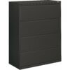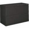 Lateral file with cabinet storage features locking hinged doors with bevel pulls and two adjustable shelves that adjust in 2″ increments. Inside height of cabinet is 36-1/4″. Bottom of cabinet has two lateral file drawers with full-width bevel pulls, steel ball-bearing suspension, and adjustable hangrails for side-to-side letter-size/legal-size filing. “One-Key” core-removable locks on door and on file lock independently. Charcoal lateral file has four adjustable leveling guides. File is certified by SCS to be in compliance with specific, indoor, air-quality emission requirements and meets or exceeds applicable ANSI/BIFMA standards.