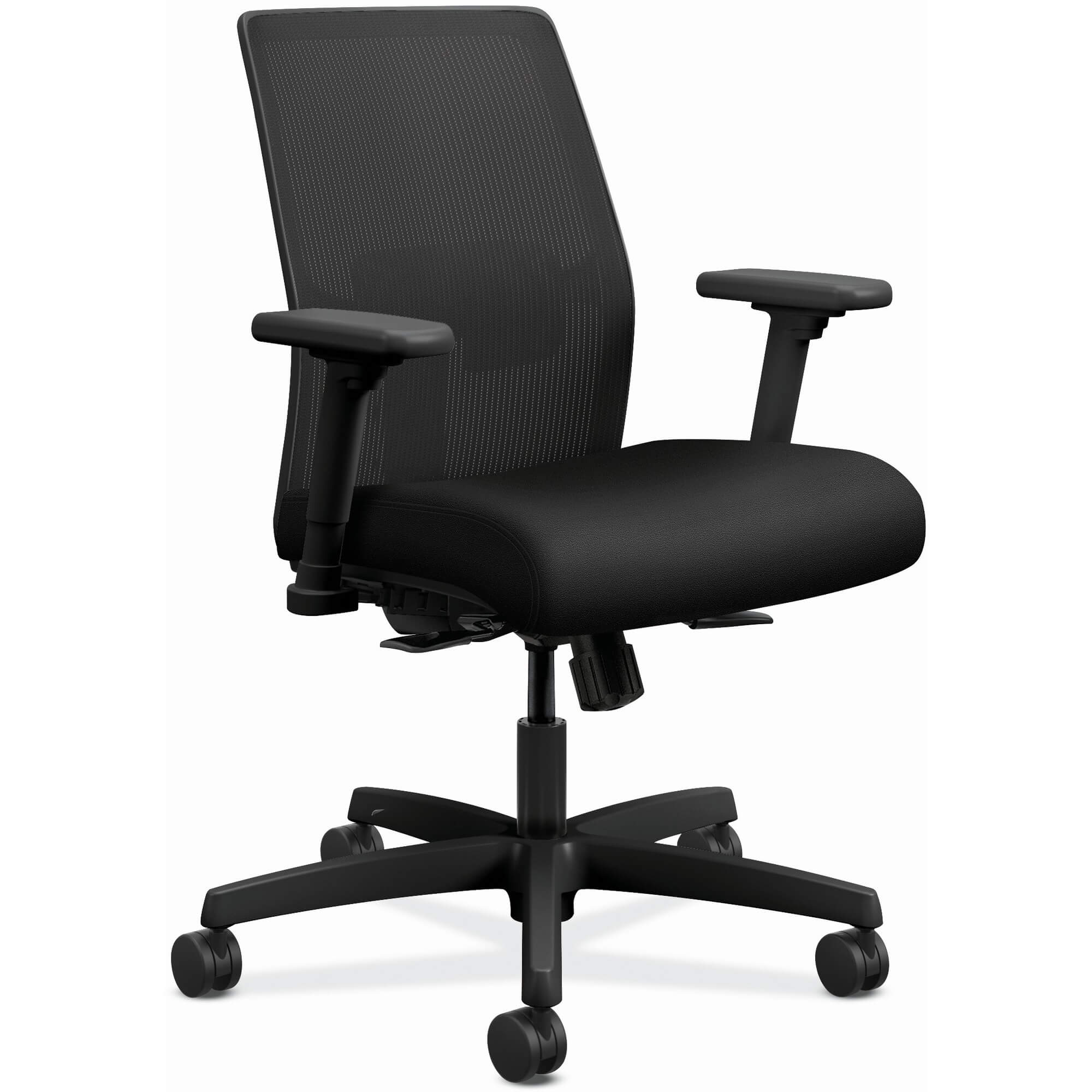 No matter who you are, how you work or where you work, Ignition seating from HON fits. This mesh-back task chair delivers style, customizable control and advanced features. Breathable, four-way stretch mesh back cradles your spine with natural lumbar support and increases airflow. Synchro-tilt control mechanism with seat slider reclines the back and seat in the perfect ratio to give you a natural posture whether sitting upright or leaning back. Height-adjustable, width-adjustable arms and an adjustable lumbar support provide a custom fit. Other functions include pneumatic seat-height adjustment from 17″ to 21″ , 360-degree swivel, tilt tension and tilt lock. The 30″ diameter five-star base is equipped with hard dual-wheel casters. Task chair also offers black fabric upholstery on the cushioned seat and a black frame. 19″ wide seat provides a usable seat depth from 16″ to 18″. Back size is 18″ wide x 26″ high. Weight capacity is 300 lb.