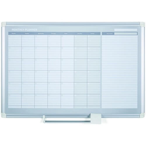 Monthly planner offers the perfect planning and presentation solution, suiting all office needs. Magnetic Gold Ultra dry-erase surface is scratch-resistant and ghost-resistant. Calendar is ideal for managing teams and schedules with ample room for any month. The write-on/wipe-off month features ruled daily blocks, Monday-through-Saturday scheduling, shaded weekends and a ruled notes column. Modern, sturdy aluminum frame allows the board to fit any environment, and a sliding pen tray keeps all accessories close at hand. Dry-erase planner includes a wall-fastening kit.