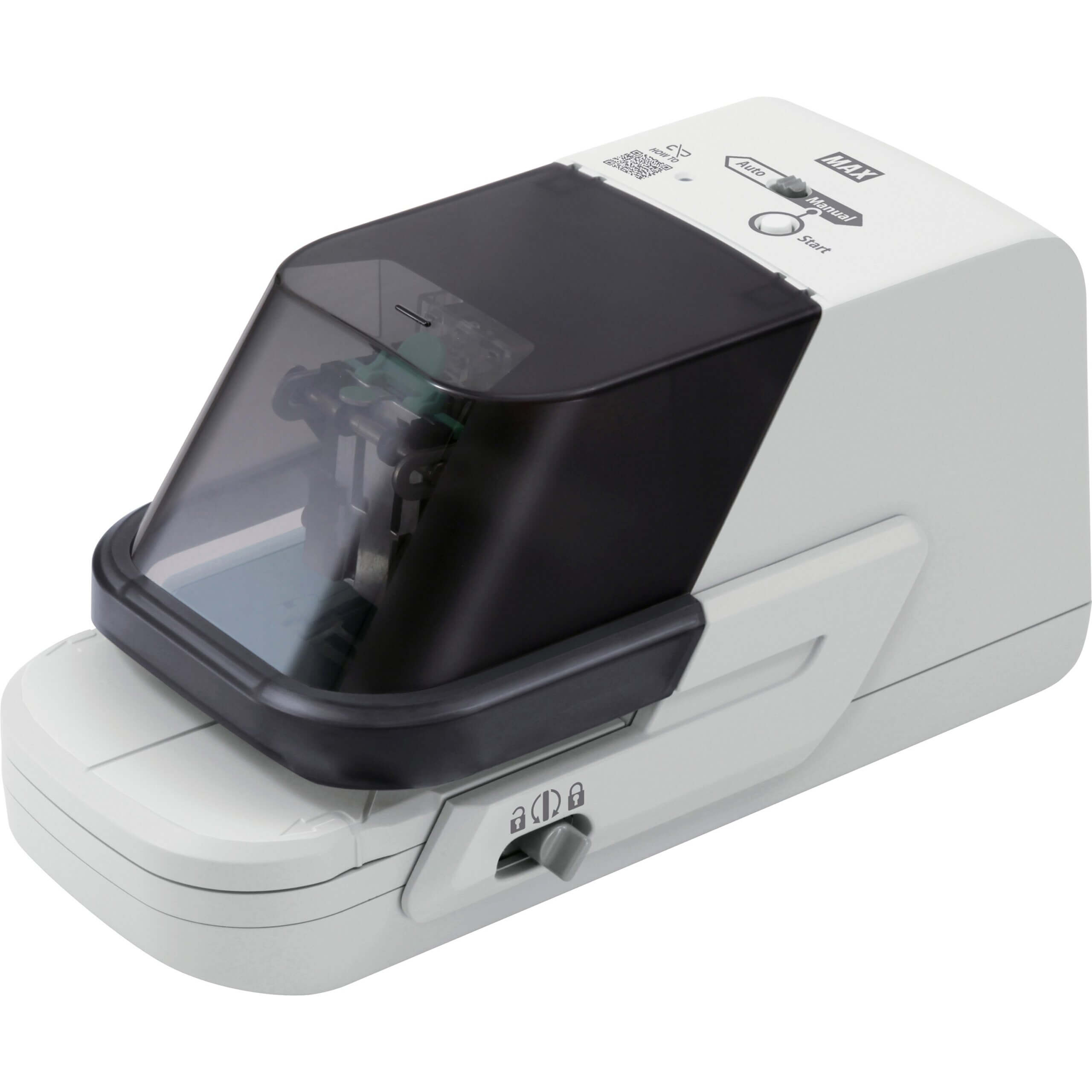 The EH-70F II Electronic Stapler lets you staple 2 to 70 sheets at the speed of two staples per second without changing the staple. It generates professional-quality stapling with the Flat Clinch Mechanism so staple close flat and papers stack neatly and evenly. Flat Clinch bends the staple ends flat without deforming the clinched staple. Quiet motor-driven mechanism means you avoid disrupting work while you staple. Designed for heavy-duty commercial and office use, stapler gives you the option of auto or manual stapling for perfect positioning of staple every time. Auto throat depth ranges from 1/4″ to 3/4″. Manual throat depth is 1/8″ to 3/4″. Metal finger guard restricts access to the stapling mechanism to improve safety. Four-point rubber grip helps stabilize the stapler. Heavy-duty stapler includes easy snap-in cartridge for its maximum load of 5,000 staples so you can staple 5,000 times continuously. It uses the Max 70FE II staples that have a 1/2″ crown and 5/16″ leg length.