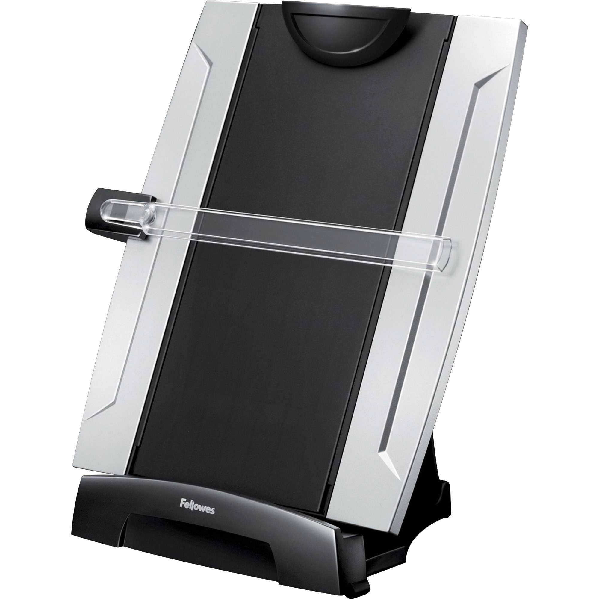 Three-in-one desktop copyholder, memo board and clipboard places documents at eye level to help prevent neck strain and improve your efficiency. Adjusts easily for A4/letter/legal paper. Copy clip holds up to 150 sheets at a time. Adjustable tilt customizes your viewing angle by up to 45 degrees. Movable line guide slides up or down and swings out of the way when not in use. Dry-erase memo board function is ideal for quick reference notes or reminders. Slide out and turn over copyholder backing to use the memo board feature. Desktop copyholder with erasable memo board matches the rest of Fellowes Office Suite Desk Accessories with smart styling in contemporary black and silver for the professional work space.