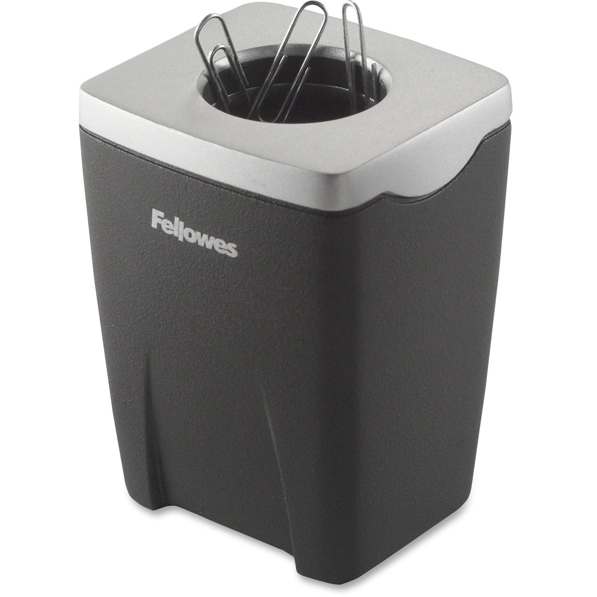 Paper clip holder keeps clips at your fingertips. Magnetic top makes paper clips easy to dispense. Removable lid makes refilling easy. Large capacity holds up to 150 clips. Paper clip holder matches the rest of Fellowes Office Suite Desk Accessories with smart styling in contemporary black and silver for the professional work space.