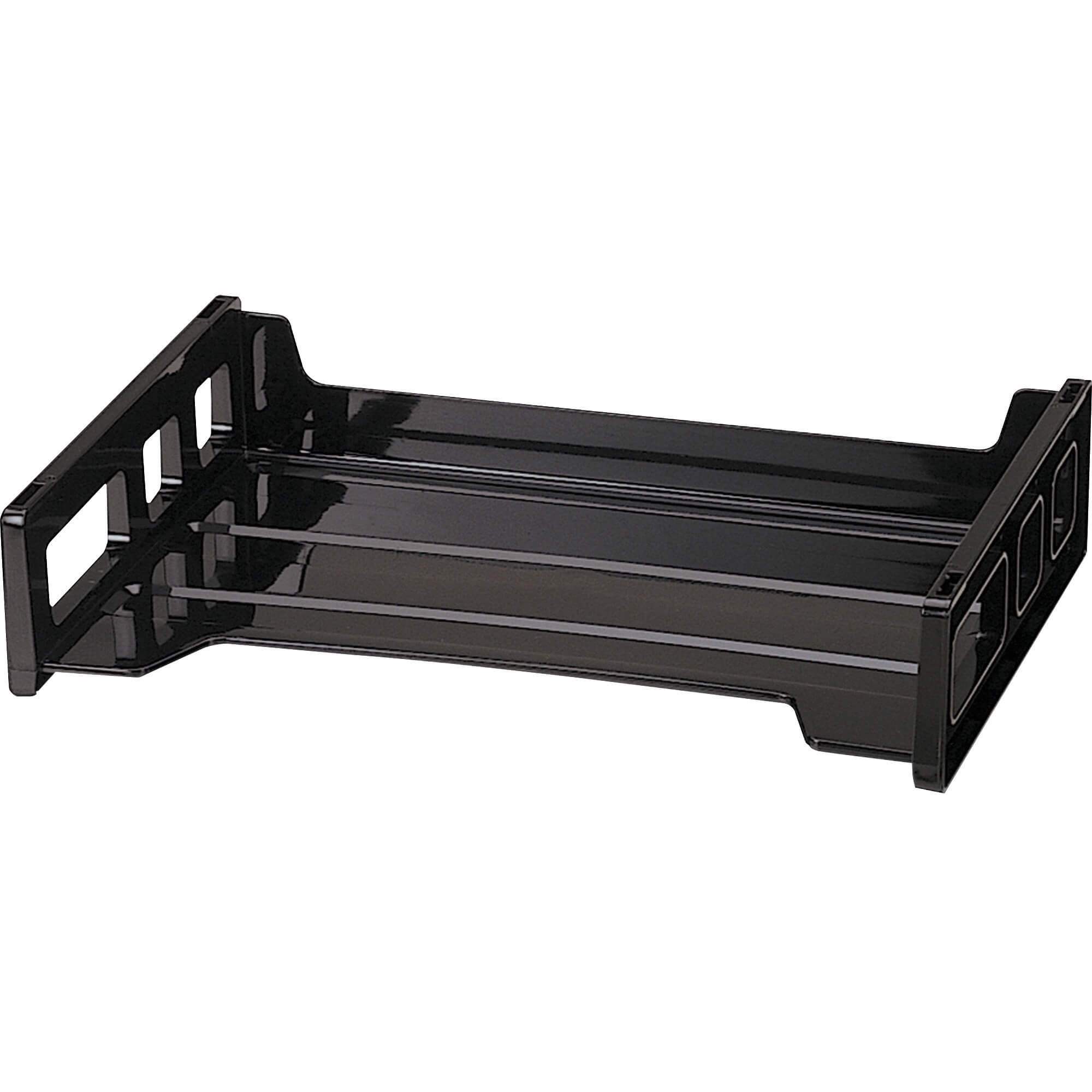 Desk tray stacks securely to create a convenient form of desktop organization for your letter-size documents. Durable, injection-molded design features a ribbed bottom to prevent paper from sticking and handles for portability. Side-loading tray is compatible with most other manufacturers’ models.