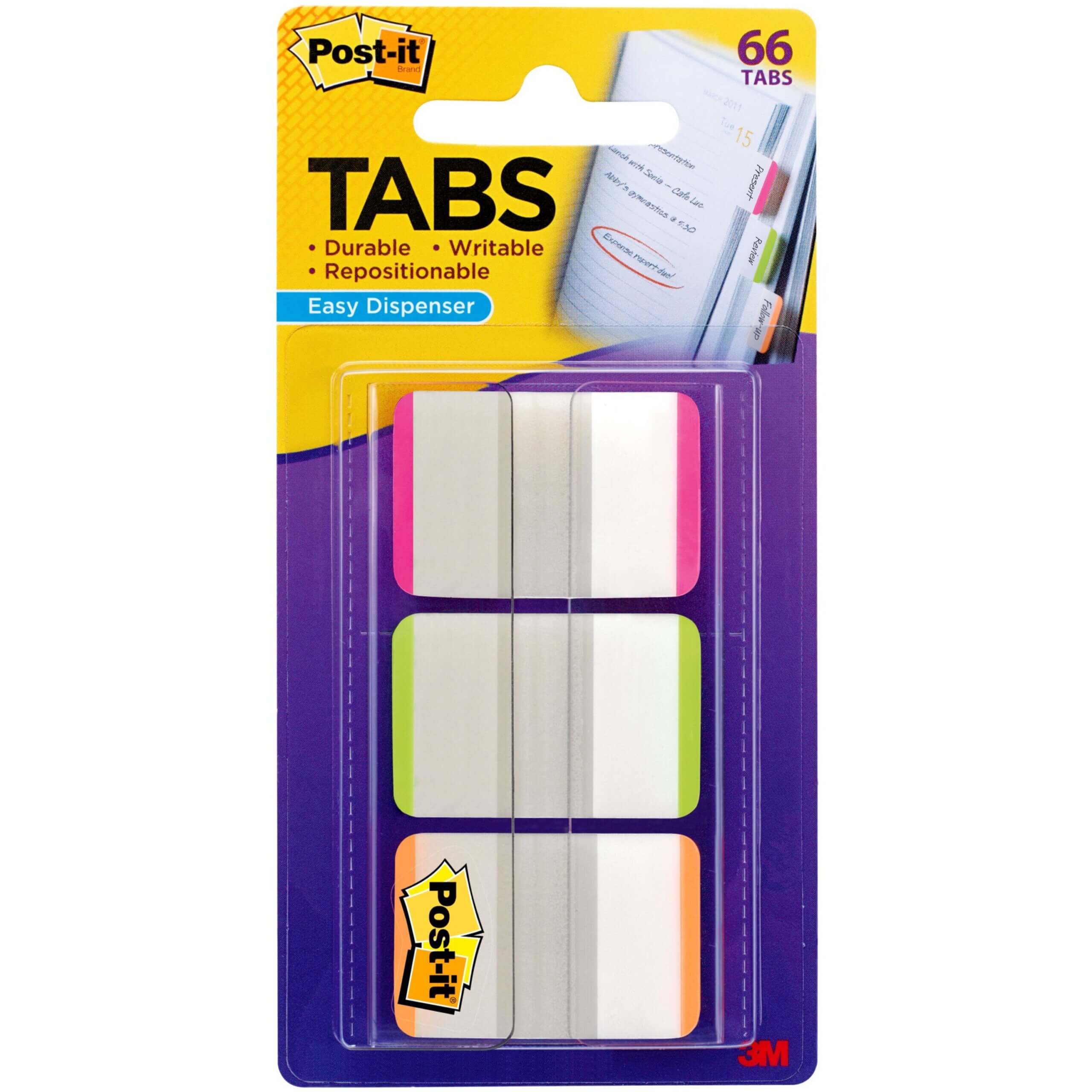 Post-it Durable Filing Tabs make it simple to index and file; easy to organize, store and retrieve documents and display an organized and professional image. Tough and long-lasting tabs stand up to repeated use. Easy to write on, apply and reposition. Tabs offer plenty of space for labeling. Holder dispenses one tab at a time.