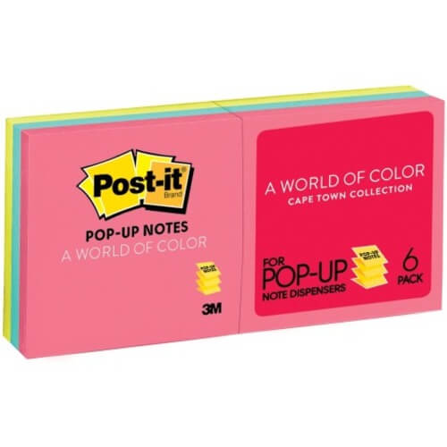 Post-it® Pop-up Adhesive Note – 600 – 3″ x 3″ – Square – 100 Sheets per Pad – Unruled – Electric Blue, Limeade, Neon Orange, Neon Pink, Concord – Paper – Pop-up, Self-adhesive, Repositionable – 6 / Pack
