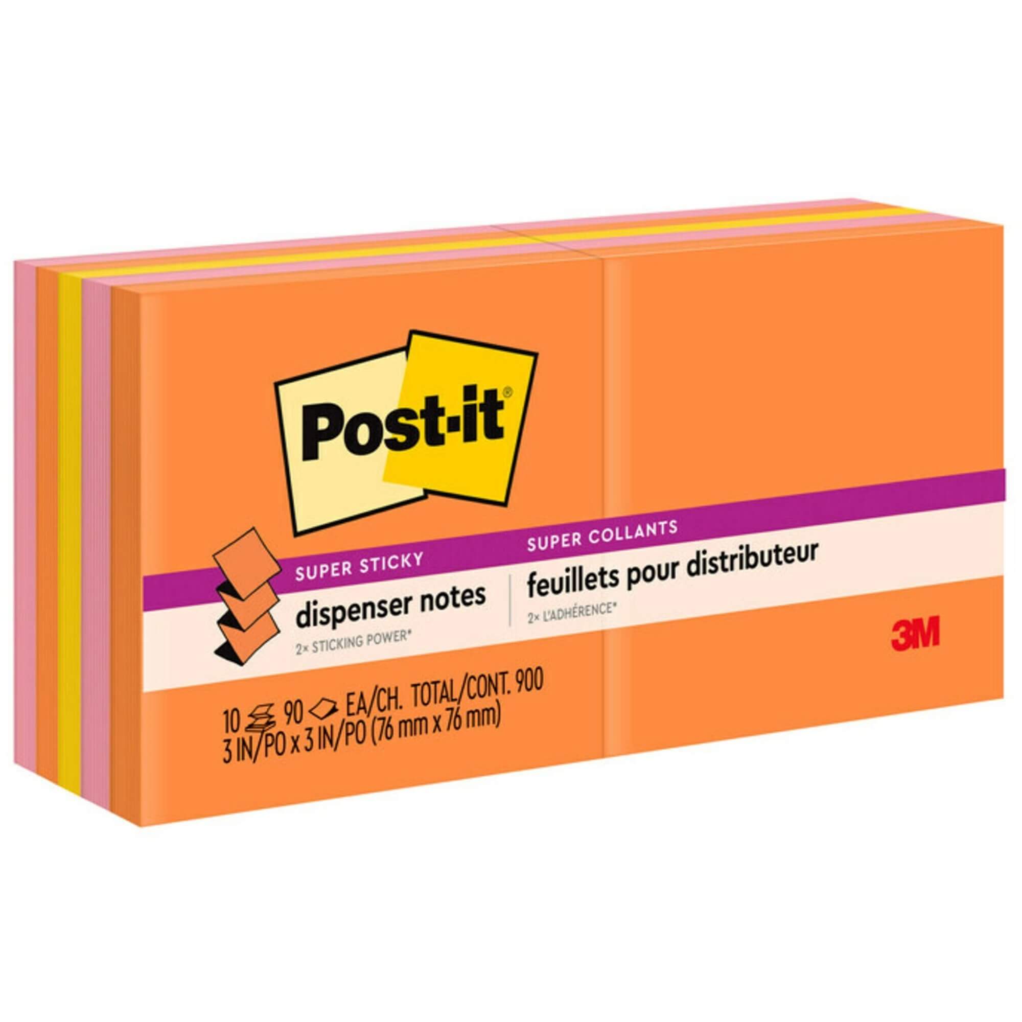 Post-it® Super Sticky Dispenser Notes – Energy Boost Color Collection – 900 – 3″ x 3″ – Square – 90 Sheets per Pad – Unruled – Vital Orange, Tropical Pink, Sunnyside – Paper – Self-adhesive, Repositionable – 10 / Pack