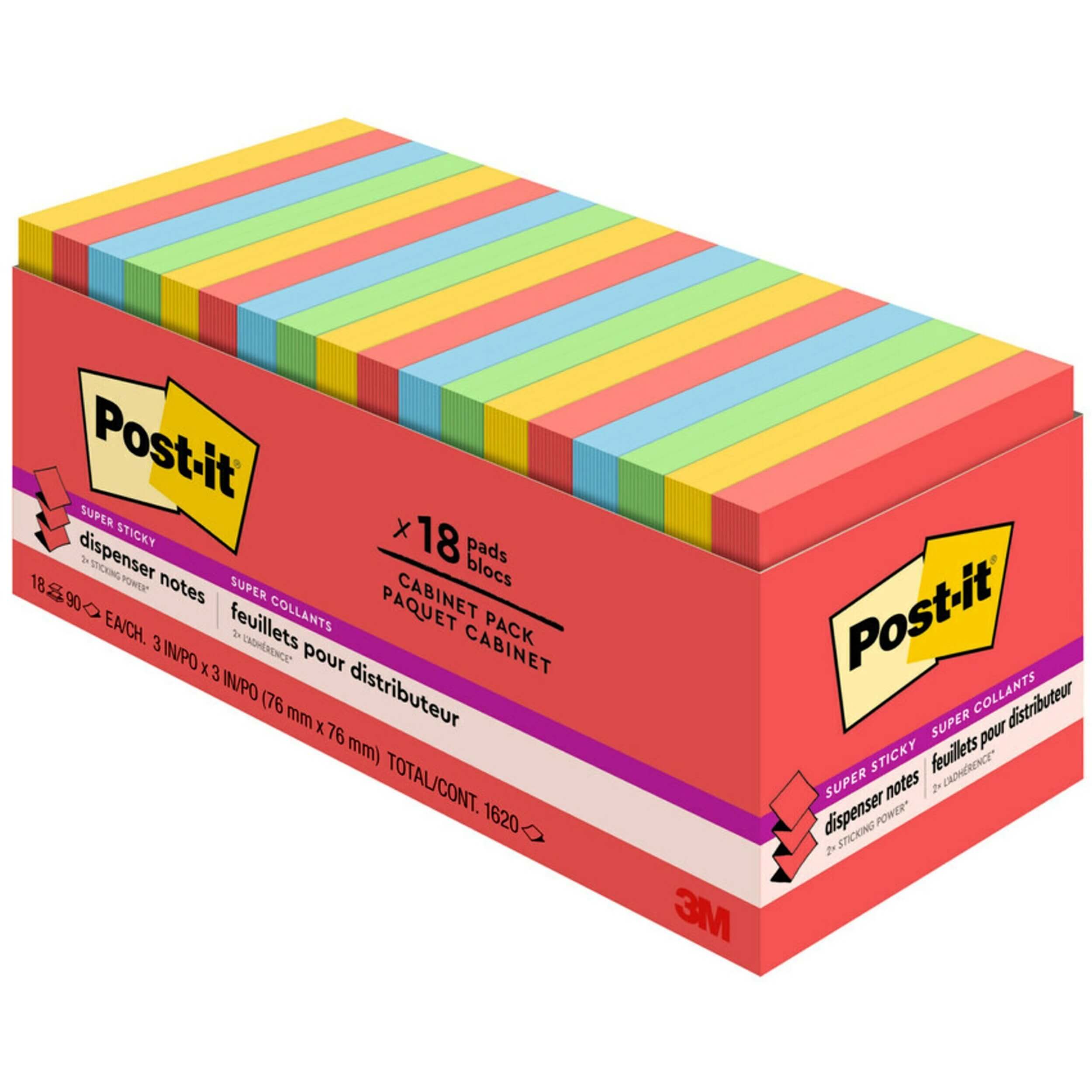 Post-it® Super Sticky Dispenser Notes – Playful Primaries Color Collection – 3″ x 3″ – Square – Candy Apple Red, Blue Paradise, Sunnyside, Lucky Green – Paper – Pop-up, Recyclable – 18 / Pack