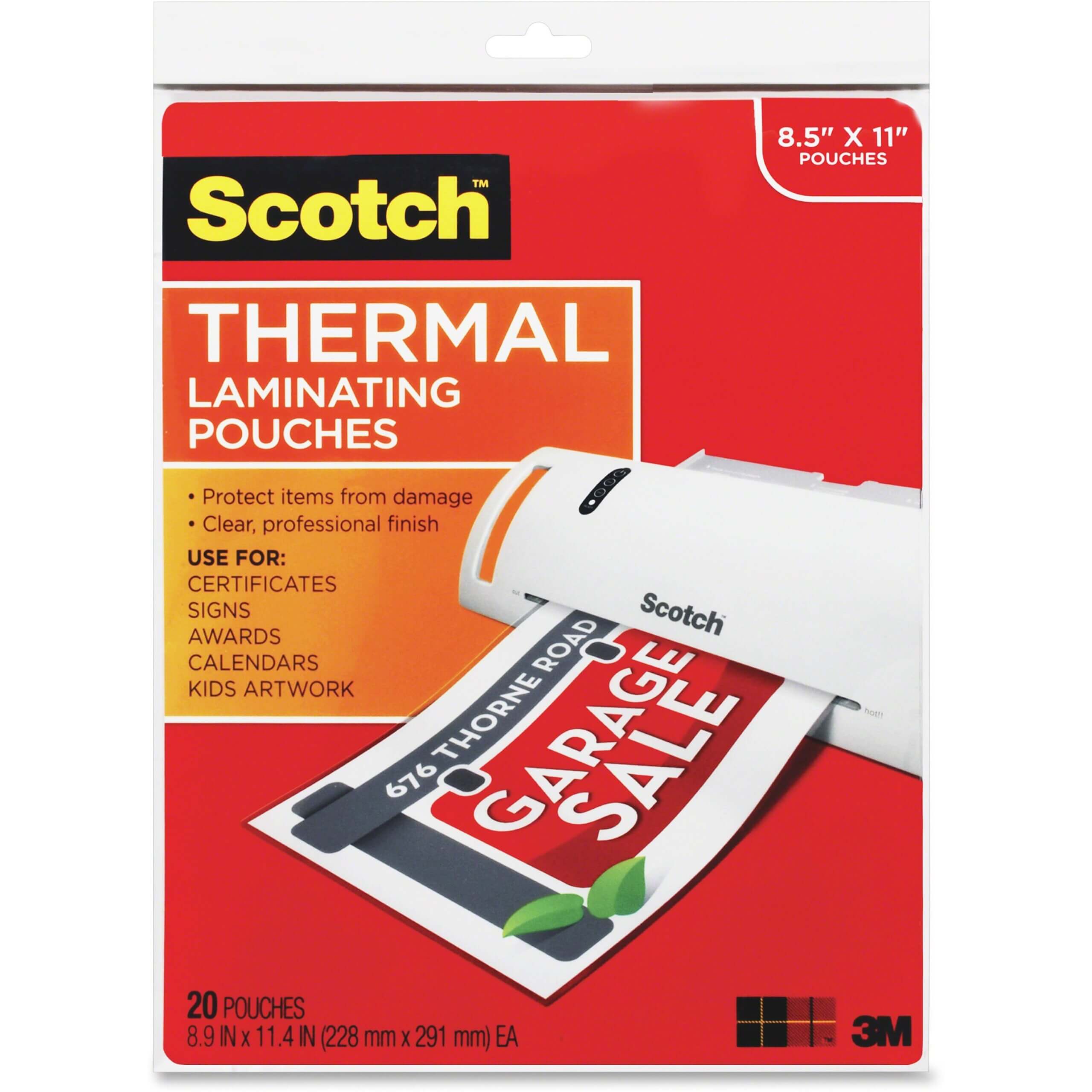 Laminating pouches are designed for use with the 3M Scotch Thermal Laminator or any standard thermal-pouch laminator. Pouches provide instant, two-sided protection for frequently handled or referred to items. Photo-safe pouches are clear to let important information show through with a professional finish. Preserve and protect documents, awards, signs, calendars, certificates, children’s artwork, schedules and more.